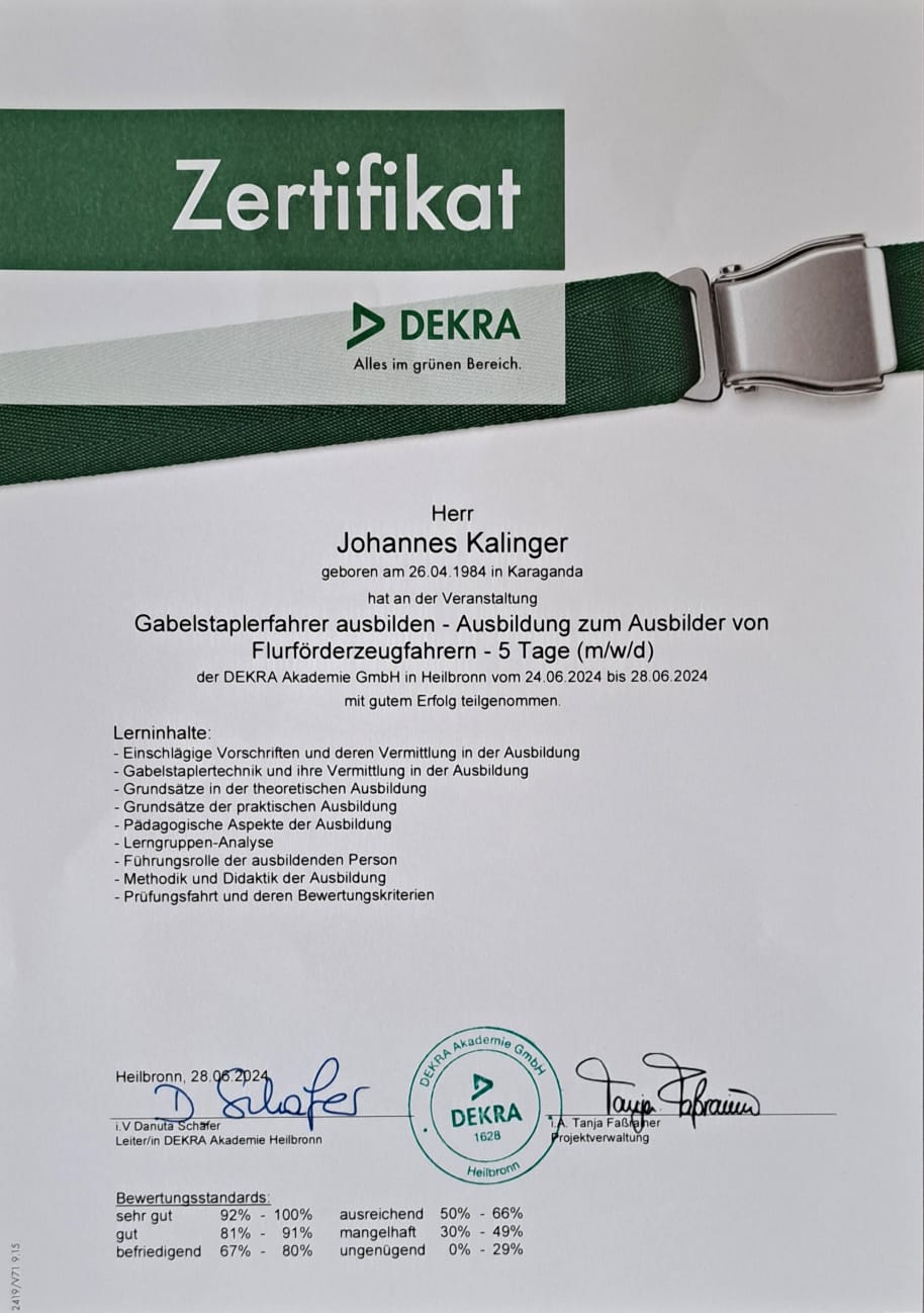 Mit mir an Ihrer Seite können Sie sich sicher sein, die richtige Entscheidung für die Sicherheit und Effizienz Ihres Unternehmens zu treffen. Meine langjährige Erfahrung und umfassende Fachkenntnis garantieren, dass Ihre Mitarbeiter bestens geschult und alle gesetzlichen Anforderungen erfüllt werden. Dies schützt Ihr Unternehmen vor rechtlichen Konsequenzen und schafft eine sichere und produktive Arbeitsumgebung.